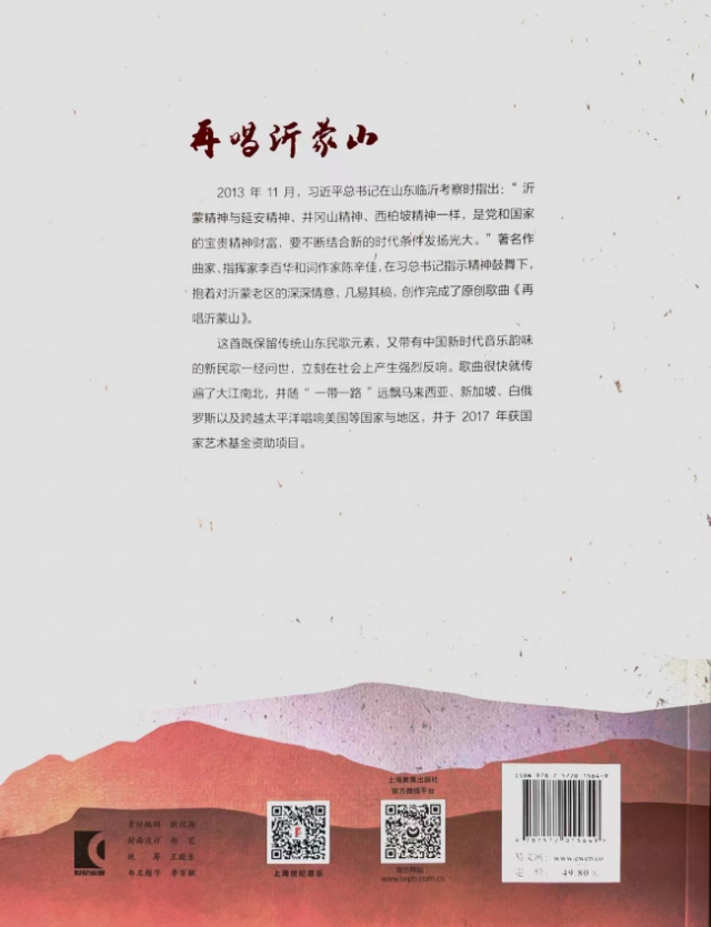 上海教育出版社慧眼识金,率先将《再唱沂蒙山》作为综合形式的大型书籍出版。该书忠实履行了习近平总书记来到山东沂蒙老区考察时所做的“沂蒙精神与延安精神、井冈山精神、西柏坡精神一样,是党和国家的宝贵精神财富,要不断结合新的时代条件发扬光大。”指示精神,成为不忘艺术初心,传承与弘扬中华优秀民族文化的践行者。