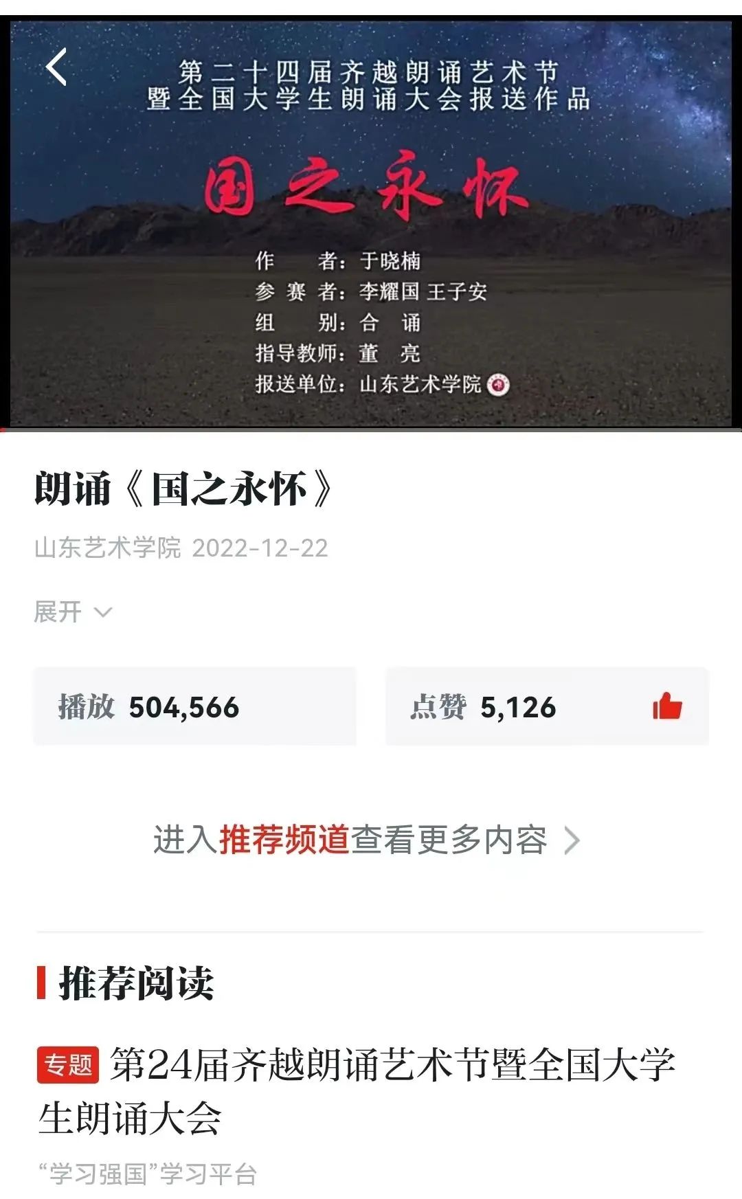 上一条:【中国教育在线】入围全国展映!第二十四届齐越朗诵艺术节山东艺术学院再获佳绩 下一条:【学习强国】朗诵《我是一条古老的河流》