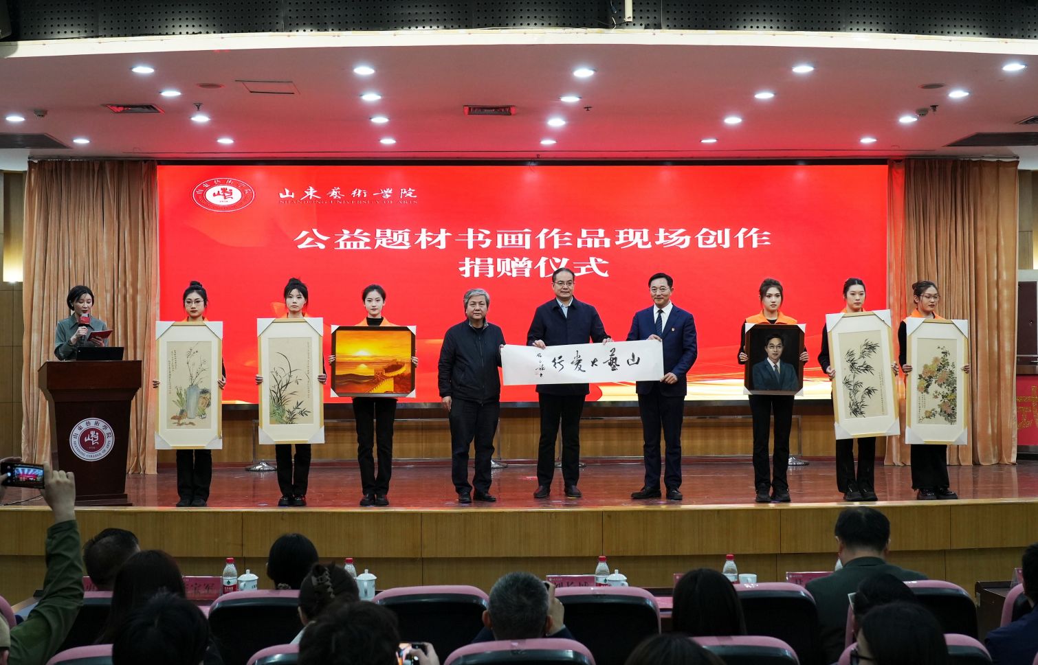 在公益题材书画作品捐赠环节,中国书法家协会副主席、山东省书法家协会主席顾亚龙教授现场创作了书法作品“山艺大爱行”,美术学院、传媒学院师生共同精心创作了油画、中国画作品。王洪禹代表学校将六件书画作品捐赠给长城爱心大本营,刘长城接受捐赠并回赠了受捐证书。爱心捐赠是山东艺术学院立足专业学雷锋,弘扬雷锋精神、开展社会服务的一次生动表达,捐赠的作品也充分体现了学校在学雷锋活动中的艺术专业优势和人才资源优势。