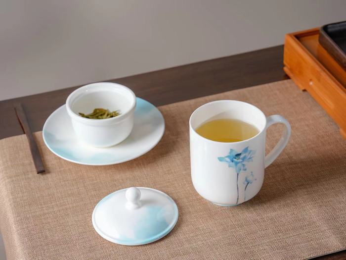 王大海坦言,把国画、陶瓷、设计,三种艺术形态结合在一起并不容易,“在选材上主要是厂家把关,而设计要尊重画者的想法,另外,更重要的还要考虑老百姓的想法。”在他看来,文化“两创”是否成功,关键在于让设计走进生活,艺术走进生活。“创作的过程当中,还是经历了很多波折的。”说着,王大海拿起该系列中的一只杯子举例,“这一套我们定位叫‘和和美美’,整个造型很圆润,寓意人民的生活和和美美。上面的画乍看是随意放的,但怎么去放,比例怎样,放到什么位置,这个很关键。一开始我们是想用偏构图,我母亲建议采用居中、对称的构图方法。而为什么选择白瓷?人刚出生的时候就是冰清玉洁,荷花的属性出淤泥而不染。”从选材、构图、造型、技艺等各方面,都有着美好的寓意。