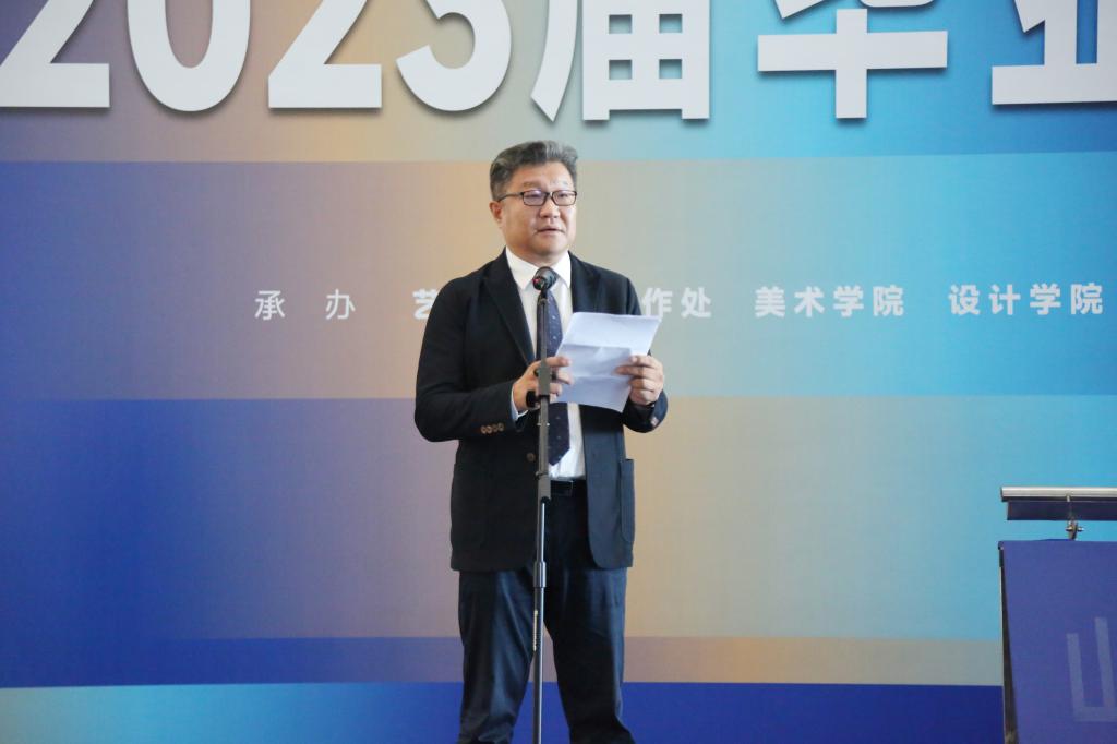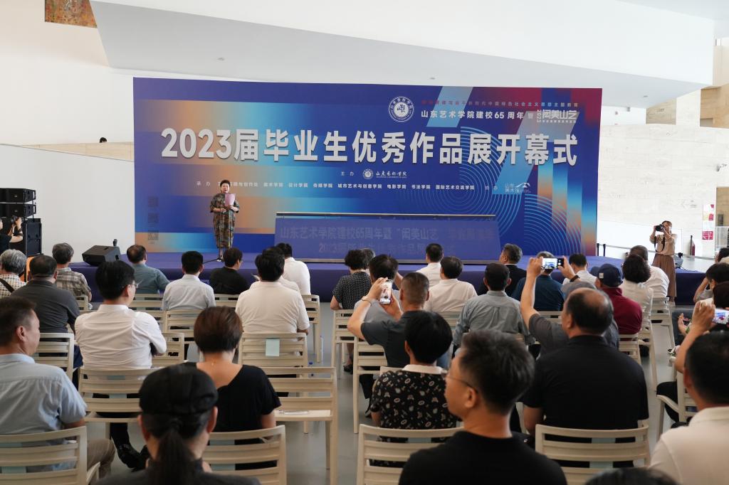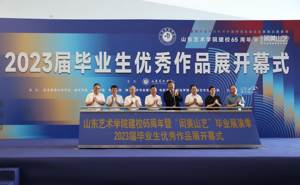 7月8日,山东艺术学院建校65周年暨“闳美山艺”毕业展演季2023届毕业生优秀作品展开幕式在山东美术馆举行。省教育厅副厅长张志刚,省委宣传部原副部长、省文旅厅原厅长徐向红,济南大学党委副书记、校长刘宗明,山东中医药大学校长李可建,山东工艺美术学院党委书记王晓娟,齐鲁工业大学党委副书记吴衍涛,邢台学院党委常委、副校长王自力,省文旅厅艺术处处长张东林,济南市文旅局党组副书记、副局长苏文,济南市民政局副局长郭爱武,省文联文艺部主任王德斌,省文艺创作研究院院长王宇鹏,省美协常务副主席张宜,省美协副主席、山东美术馆馆长杨晓刚,省话剧院院长董璇,省书协驻会副主席王瑞,省电影家协会驻会负责人杨峰,山东艺术学院院长徐青峰,原院长王力克,党委副书记杨西国,党委委员、纪委书记、省监委驻学校监察专员胡凤莹,党委委员、副院长苏茂兴,原副院长刘大力,党委委员孔宪坤参加开幕式。著名老艺术家和专家教授李振才、陈建华、李勇、岳海涛、刘青砚、李平及来自各兄弟院校和社会各界的嘉宾300余人参加开幕式。