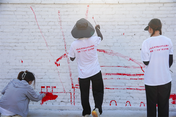 开展文化墙绘,共建和美乡村。实践团围绕党建和乡村振兴主题,迎着高温酷暑,自备画笔、颜料等物资,在沙土镇穆谢庄行政村和赵庄行政村开展主题墙绘。经实地考察,实践团根据当地需求制定出一套完善的墙绘方案。起稿定型、涂底上色、精描图案,队员们分成3个小组,分工明确、配合默契,认真勾勒每一处细节,一幅幅精美的画面徐徐展开,引来村民纷纷围观称赞,为乡村添加亮丽色彩,也在潜移默化中涵养了村民的精神。