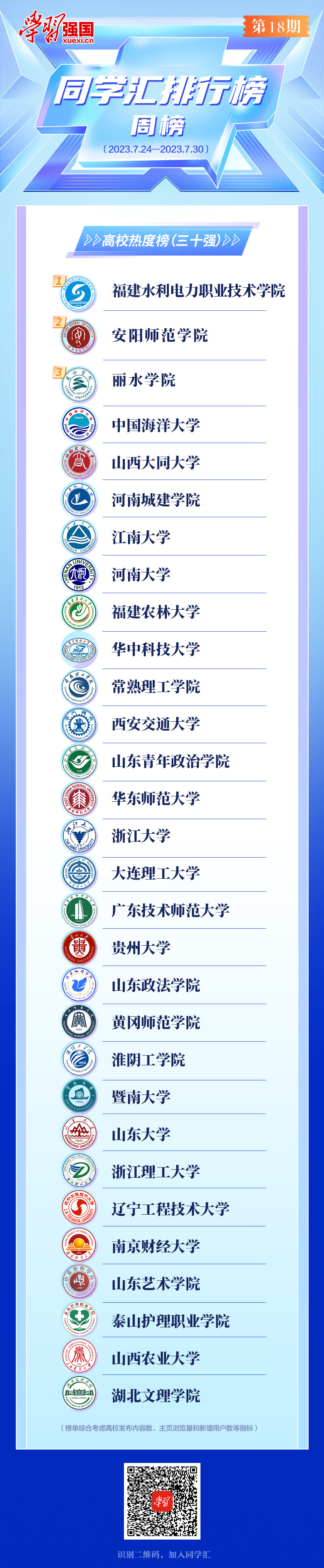 【学习强国】同学汇排行榜|高校热度榜第18期周排行榜(2023.7.24—7.30)