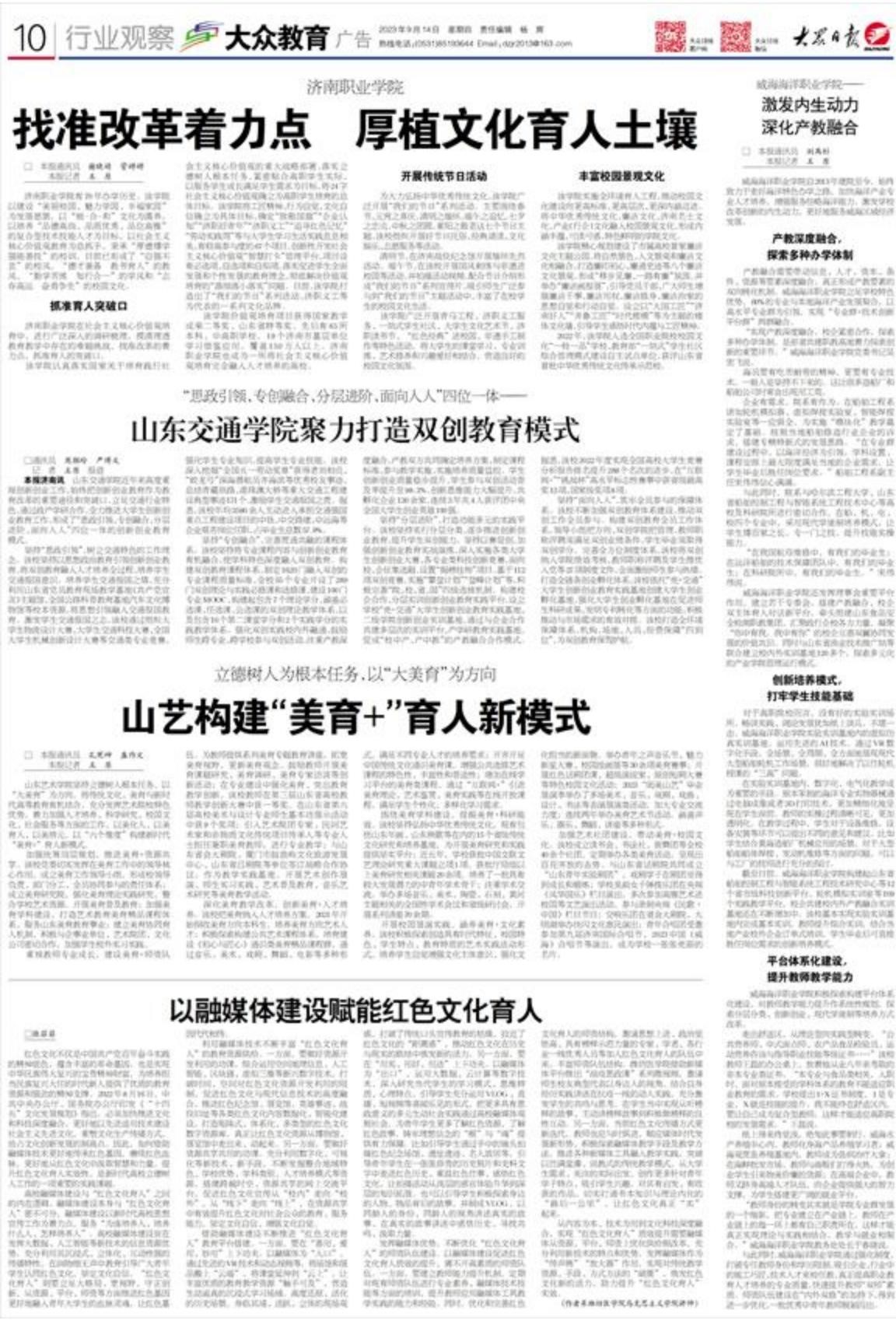 加强统筹顶层规划,推进美育+资源共享。该校党委切实发挥在美育工作中的领导核心作用,成立美育工作领导小组,形成校领导负责、部门分工、全员协同参与的责任体系;成立美育研究院,强化美育理论实践研究,整合学校艺术资源,开展美育普及教育;加强美育学科建设,打造艺术教育美育精品课程体系,服务山东美育教育事业;建立美育协同育人机制,积极与企事业单位、艺术院团、文化公司密切合作,加强学生校外实习实践。