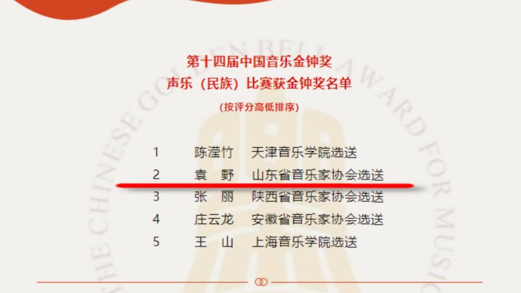 10月24日,第十四届中国音乐金钟奖声乐(民族组)比赛成绩揭晓,山东艺术学院青年教师袁野摘得“音乐金钟奖”。