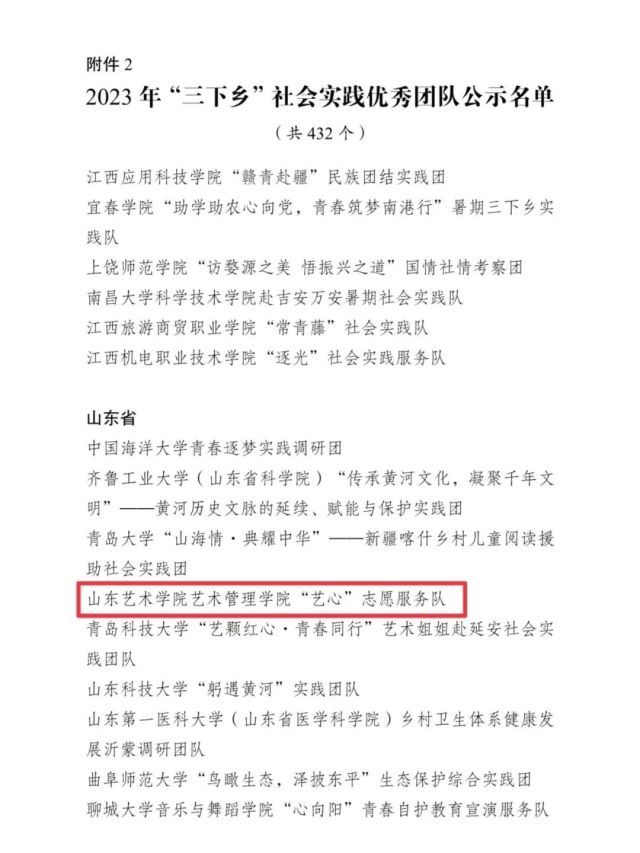 12月6日,共青团中央公布《2023年全国大中专学生志愿者暑期文化科技卫生“三下乡”社会实践活动总结通报结果》,山东艺术学院艺术管理学院“艺心”志愿服务队被评为2023年“三下乡”社会实践全国“优秀团队”,学校被评为“优秀单位”。这是该校“三下乡”社会实践首次荣获团中央表彰。