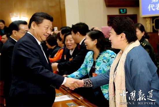 在十二届全国人大三次会议上习近平总书记与刘晓静亲切握手交谈