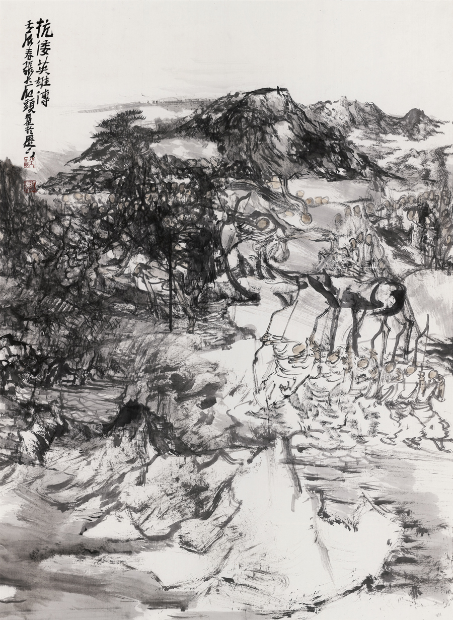 纵观张志民的作品,笔墨浓郁酣畅又苍健雄奇,画面气魄宏大而不失绵密,有一种从容不迫外弛内张的视觉冲击力。所谓纳烟云日月之伟观,揽雷霆风云之奇变。造化之神秀、阴阳之明晦,一入画家腕底,即奇思络绎,奔赴笔端。笔势飞扬间,气韵贯通,意境洵然而成。由此激荡出画家蓬蓬勃勃的生命元气和凛凛然然的人格力量。山水画是人的生命意识到张扬与披历,更是人与自然的对话媒介。三月的花丛、五月的麦田、八月的行云、腊月的飞雪,种种意象,在他的胸臆间,酝酿出丰富的心象;画山画石,在他笔锋里,石之圆润、石之狞厉,甚而石之舞蹈、石之鸣唱,均一一析出。有意高歌无词曲,满谷狂风满谷情。所以,在张志民的作品里,那若隐若现的泉溪,似云似霭的“计白当黑”,笔走龙蛇、墨气淋漓的宛转山形和扶苏草木,如入玄冥之地,卓然气局,令人击节。环视当下画坛,亦步亦趋者甚众,大开大阖者寥寥。张志民作品多变的意象形态,奇诡的章法形式,放达的笔墨语言,不是横空出世的无本之木。而是他师法传统,师法造化,师法前人,转益多师,蜕化运用的结果。更是他立足当下,立足本土,融汇中西,别开歧路的结果。虽然我们在他的作品里,仿佛见到黄宾虹黑密厚重的墨象和傅抱石笔走龙蛇的笔意,乃至陆俨少纵横奇绝的布局,以及新浙派的灵动与雅致。显然,这种印象无以概括或演绎张志民作品的美学价值和精神旨归。山川与予神遇而迹化。张志民用自己独立的方式解构和重建了一个新的自然。如果将张志民的作品置入历尽百年中国画论争的文化背景的架构上,乃至文化多元的当代语境中纵横考察,他的作品的美学价值和精神旨归想必跳脱和超越线性的守成与创新的价值评判,从而步入一个更具历史挑战性的更加自由放达的美学表现空间。这就是他的作品所表现的结构性力量是我们重新认知其作品的一个文化支点,即作品所贯穿的人类追溯生命故乡的普世理念和人文情怀。