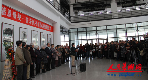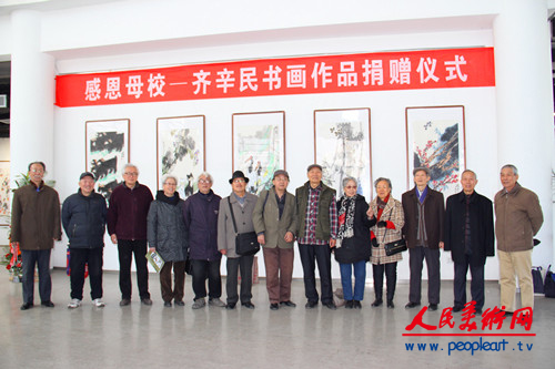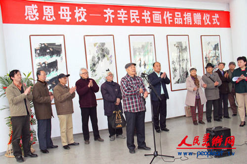 齐辛民先生在仪式上讲话。齐辛民先生在讲话中表示,此次回到母校非常激动和高兴,本次展览和捐赠作品活动得到了学校领导、老师和相关部门的关心、支持和帮助,他对此表示衷心感谢。齐辛民先生说,人的一生中在学校受教育的时期是非常关键的,一个人走向社会取得成功与其在学校受到的教育是分不开的。他讲到,我们通常称自己就学的学校为“母校” ,就说明学校在一个人心中的位置。母亲是至高无上的爱,“老师如父母,同学如兄弟,”这句话很能说明学生与老师的密切关系,我们永远不会忘记母校和老师对我们的恩情,母校和老师永远值得我们尊敬。作为一个毕业50多年、年近80岁的老学生,回首求学的艰苦岁月,老师勤勤恳恳的教,学生非常努力的学,是值得回忆的时期。齐辛民先生表示,这次回母校举办作品展和捐赠作品,就是怀着感恩之情,也是向母校交了一次“作业”,希望得到领导、老师的教导、批评和指正。