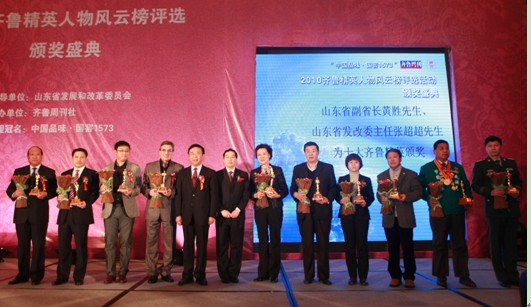 带领500多名山东援建干部和3万多名援建大军,经过800多个日夜的艰苦奋战,在断壁残垣上用意志舞出了一个新北川的山东省对口援川工作指挥部总指挥徐振溪;以400多万字的长篇巨著《你在高原》震撼中外文坛的我国著名作家,山东作家协会主席张炜;以非凡勇气和超常谋略使产业之舰稳踞中国纸业榜首,并成为全国唯一一家A、B、H三种股票上市公司的山东晨鸣纸业集团股份有限公司董事长陈洪国;带领球队摘取2010中超联赛冠军的鲁能泰山足球俱乐部主教练伊万科维奇;剑扫画坛,一举夺得曾两届空缺的泰山文艺奖国画创作第一名山东女画家协会主席王小晖;带领企业从村办油棉厂变身为而今的中国糖都、中国玉米油城的西王集团有限公司董事局主席王勇;将企业打造为全国钢结构数控加工装备领域的领头羊,并强势占领了欧盟高端市场的山东法因数控机械股份有限公司董事长李胜军;用一杯豆浆征服亿万消费者的山东九阳小家电股份有限公司董事长黄淑玲;几年来取得39项技术创新成果,其中25项获国家专利的民间环保人士、全国五一劳动奖章获得者刘宝敬;东海砺剑卫世博,海陆管控万无失的山东公安边防总队海警部队,获得了2010齐鲁精英人物风云榜--十大齐鲁精英奖。