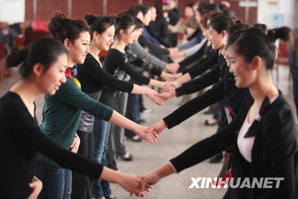 当日,上海世博会山东馆礼仪人员培训在济南正式启动。参加培训的18名候选礼仪人员是从山东大学、山东师范大学、山东艺术学院等高校层层选拔出来的。她们将接受形体、外事礼仪、世博会知识、外语等方面的培训,最终确定16名礼仪人员。新华社发(龚辉 摄)