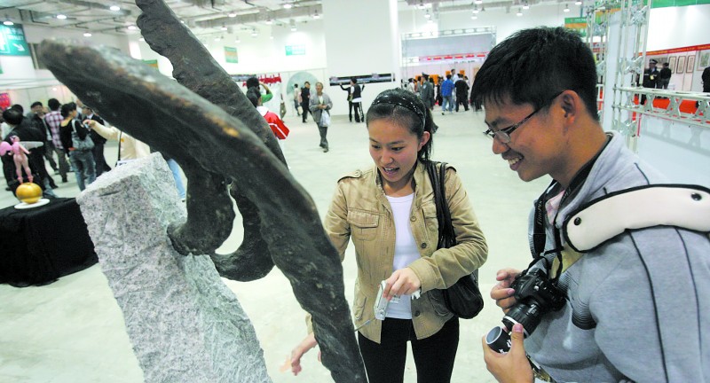 观众在参观当代艺术邀请展上的雕塑作品"天生"。(记者 张中 摄)