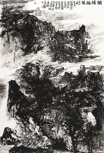 《铜墙铁壁》为竖幅山水,立意气势磅礴、气象万千。纯水墨的大方气度营造下,前山前景山石峻逸,下自成溪,重墨层染后愈显山水之高远沉稳肃穆;后山因中间令人叹为观止的贯通云气而缥缈灵动,自然将画面深远塑造至绝妙处,云松互绕,风生水起,山峦之厚度、云水之灵气,相生相依,互为因果。于是,整幅画面端庄凝重,法度森严,特别令观者不得不为之动容和心生激情。同时,又因云气水榭之空灵淡远,画面又同时透出庄重之外的灵犀。