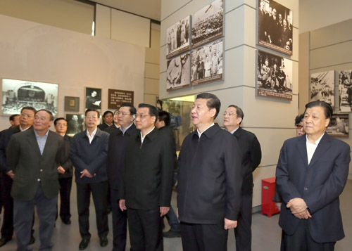 在十九世纪末列强割占领土、设立租借地、划定势力范围示意图前,在鸦片战争期间虎门的大炮前,在反映辛亥革命的文物和照片前,在《共产党宣言》第一个中文全译本前,在《中国共产党的第一个纲领》等反映中国共产党成立的文物和照片前,在李大钊狱中亲笔自述前,在中华人民共和国第一面五星红旗前,在党的十一届三中全会照片前,习近平等不时停下脚步,认真观看,详细询问和了解有关情况。