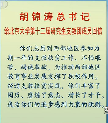2011年5月10日,中共中央总书记、国家主席、中央军委主席胡锦涛给北京大学第十二届研究生支教团成员回信。这封充满深切关怀、带着殷切嘱托的回信全文如下: