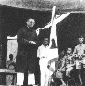 | 为了全面推行普及教育,陶行知号召“全国小学生总动员做小先生”,提倡“小先生制”。图为陶行知在山海小先生总动员大会上讲话。 |