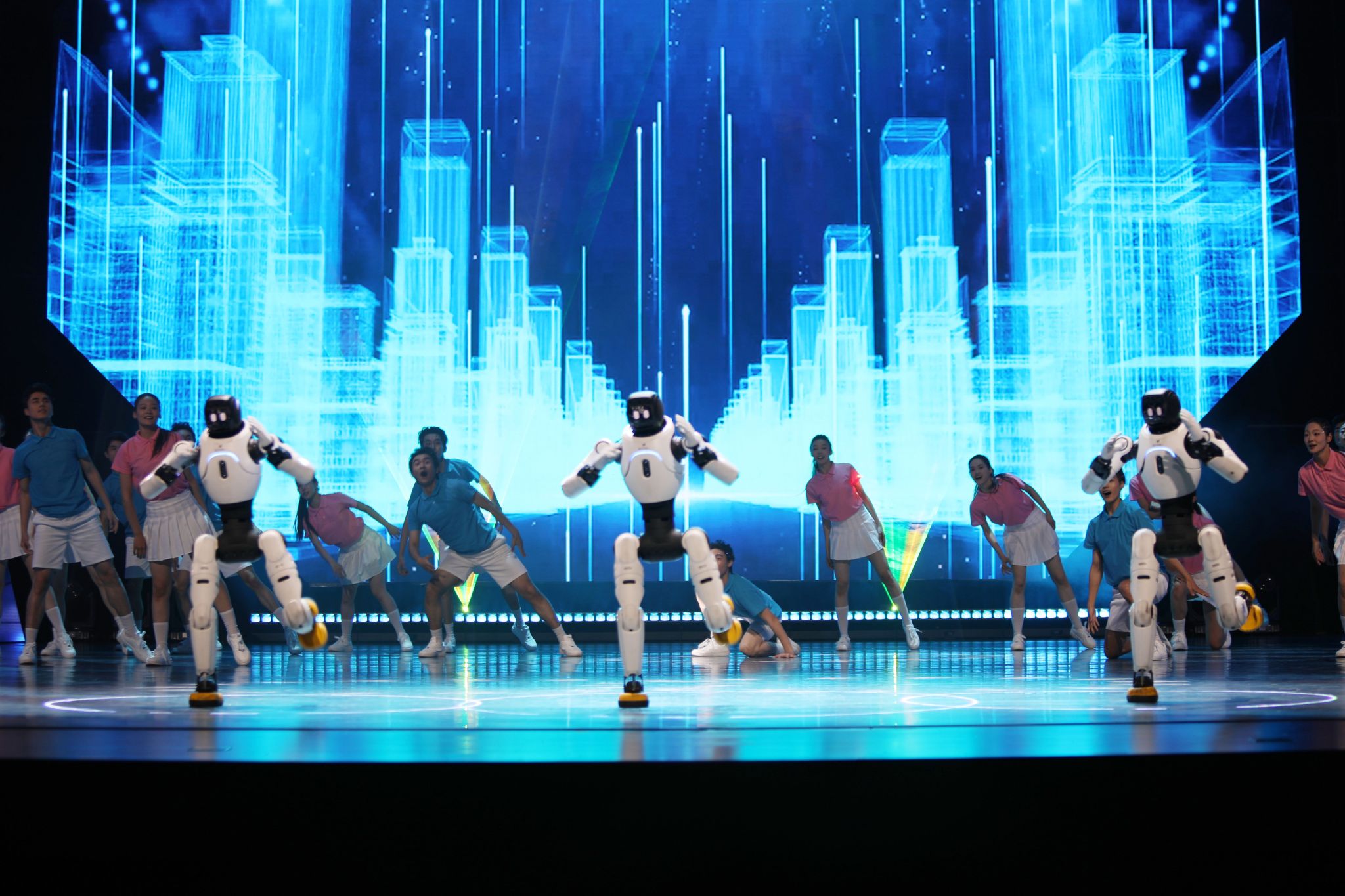 “曲韵千年传雅意,檀板丝弦说古今。科创万象启新声,光影数据绘未来。”演出在我校舞蹈学院颜培旭、李悦颜等表演的舞蹈《你好未来》的动感旋律中拉开帷幕——智能机器人随着鼓点翩翩起舞。当机械臂划出人类身段的优美韵律,瞬间点燃全场热情,一场传统艺术与现代科技交相辉映的视听盛宴正式开启。